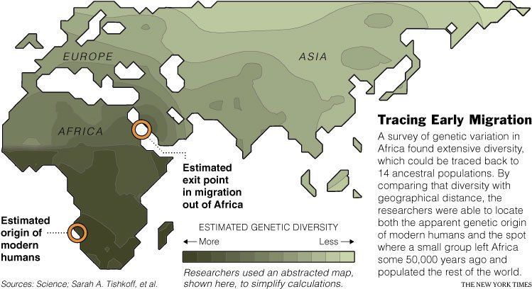Certo, la variabilità può ricominciare ad aumentare col tempo e la globalizzazione può rimescolare un po’ il genoma del genere umano, ma è un processo molto più lento (o molto più recente) delle migrazioni. Tanto è vero che ancora oggi si vede come la variabilità genetica sia massima (seppur bassa) in Africa e sempre minore mano mano che ci si allontana dalla culla di Homo sapiens, seguendo le antiche rotte migratorie.