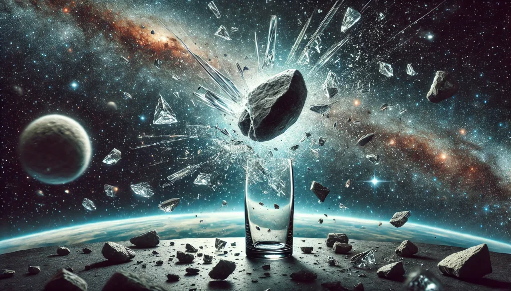 Questo tipo di diagramma è la rappresentazione semplificata del modello di spaziotempo di Minkowski, dal nome del matematico che lo ideò nel 1907. Qui l’evento Rottura del bicchiere è quindi all’interno del cono di luce del futuro che ha origine dal punto O. Per vedere un vero cono, e non un semplice triangolo, di solito si usano due coordinate spaziali, anche se poi in realtà andrebbero usate tutte e tre le dimensioni spaziali più il tempo, e quindi l’ipercono risultante non sarebbe da noi realmente visualizzabile né immaginabile.