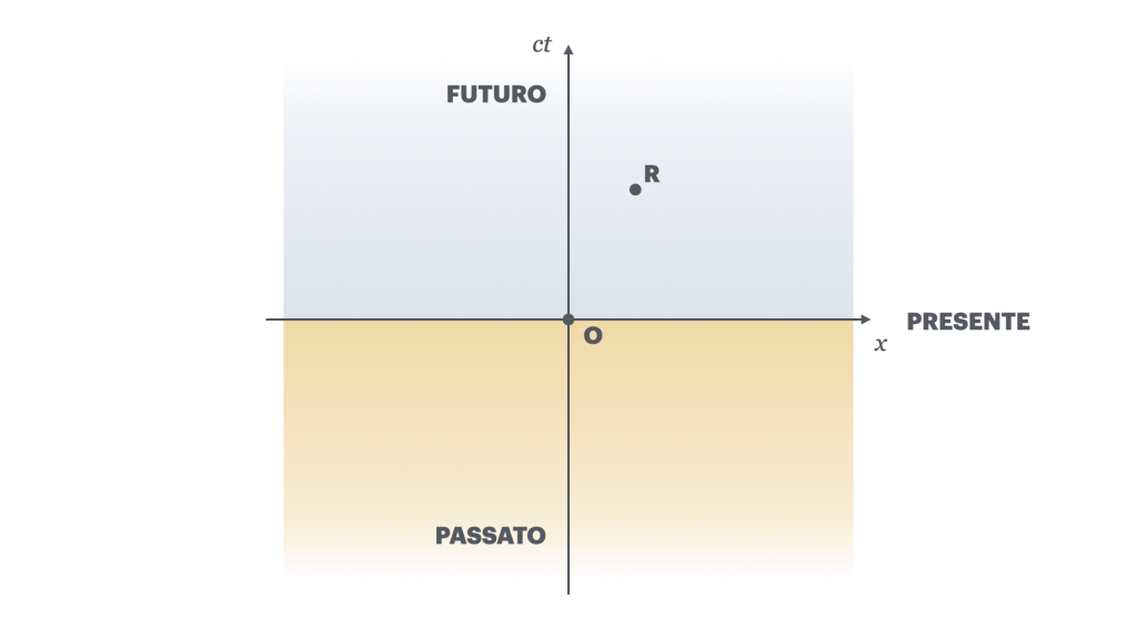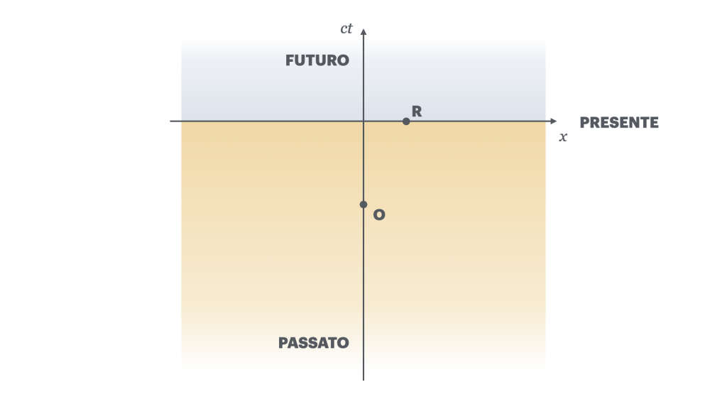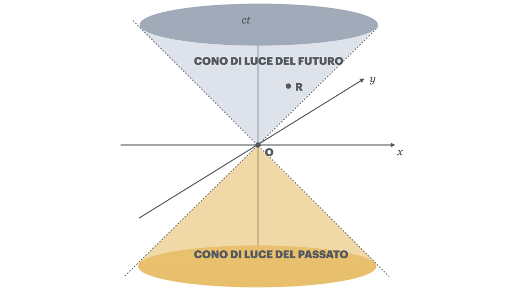 Tralasciamo per un momento l’evento della morte di Luna e immaginiamo semplicemente che io rompa un bicchiere lanciando un sasso. Immaginiamo che “qui” e “ora” siano la posizione nello spazio della mia mano e l’istante di tempo nel quale lancio un sasso verso un bicchiere di vetro davanti a me. Queste informazioni sulla posizione e sull’istante costituiscono le coordinate a 4 dimensioni di un punto dello spaziotempo, ovvero l’evento Lancio. Dal momento che io sono anche il cosiddetto Osservatore, possiamo posizionare l’evento lancio nell’origine di un grafico cartesiano, e contrassegnarlo con la lettera O. Gli assi di questo grafico sono l’asse x, rappresentativo di tutto lo spazio, e l’asse y, che qui rappresenta invece il tempo. Affinché la rottura del bicchiere possa essere considerata causata dal lancio del sasso è certamente necessario che l’evento Rottura (R) sia nel futuro dell’evento Lancio, ovvero semplicemente più in alto dell’asse x, come visibile nel grafico qui sotto. Se il bicchiere dovesse invece rompersi nel passato o nel presente del lancio (quindi sotto o in corrispondenza dell’asse x), ovvero R fosse nel passato o nel presente di O, allora l’evento Lancio non potrebbe esserne certamente la causa.