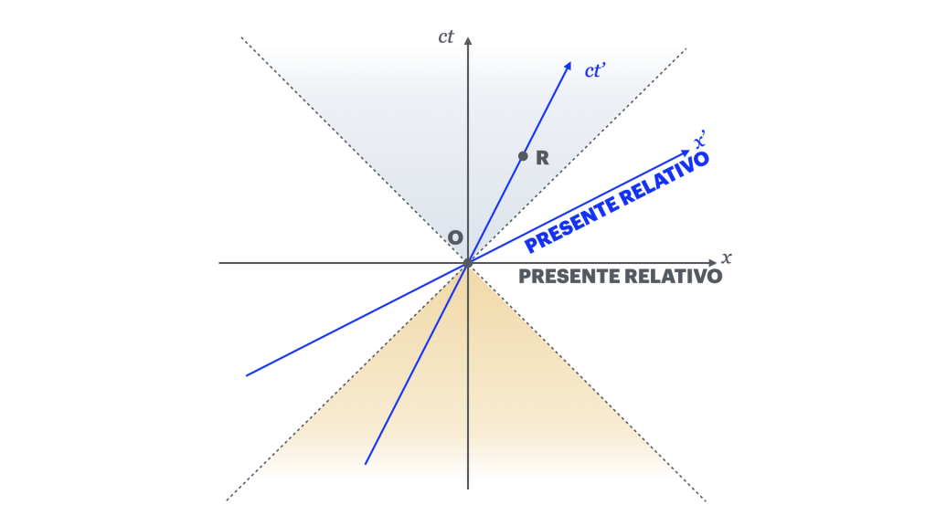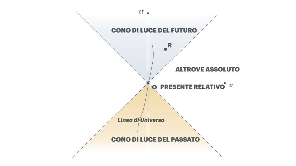 Fuori dal cono di luce del futuro ci sono invece tutti quegli eventi che sono causati da qualcos’altro e non possono essere connessi causalmente con me, dei quali, cioè, l’osservatore non può esserne la causa: l’Altrove Assoluto. Fra questi, un bicchiere che si rompe nel mio futuro ma prima che un raggio di luce possa raggiungerlo. E poi esiste anche un sottoinsieme di eventi, tutti posti esattamente sull’asse x, che avvengono simultaneamente all’evento Lancio in O. Possono essere l’esplosione di una supernova lontana così come il battito d’ali di una farfalla a poca distanza da me. Tutti questi eventi giacciono sulla mia linea di simultaneità nel momento del lancio del sasso, e costituiscono il mio Presente Relativo.