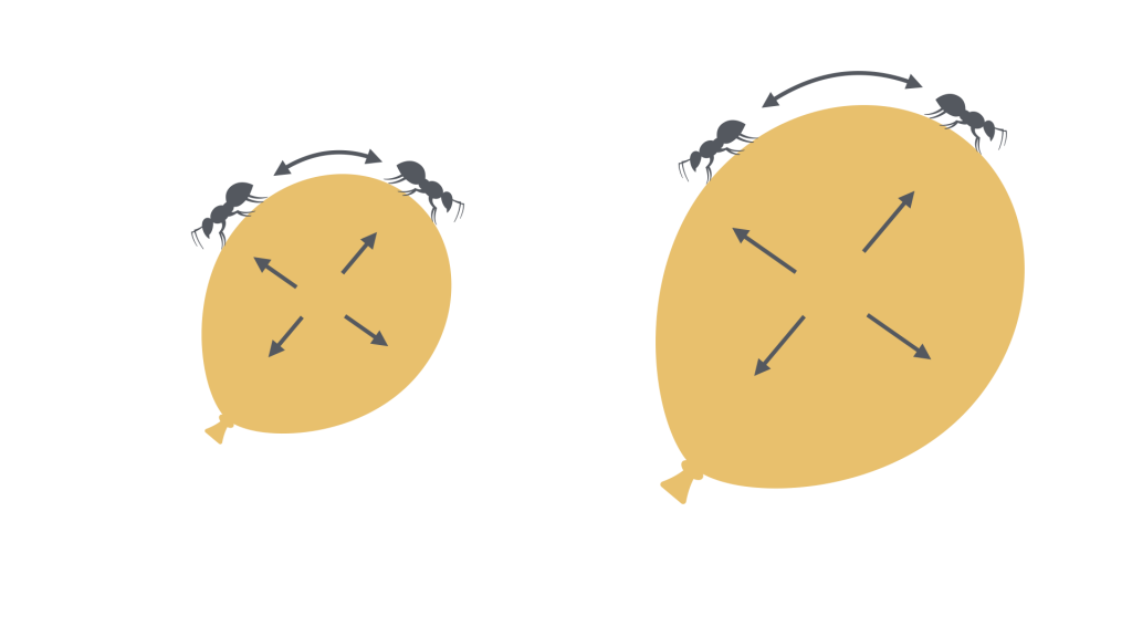 Possiamo però abbandonare la scala locale di validità della Relatività Speciale per immaginare come l’espansione dell’Universo, causata dal Big Bang, ci potrebbe aiutare a capire se c’è una speranza di potersi ritrovare sulla linea di simultaneità di un evento del proprio passato. Grazie ad Edwin Hubble, sappiamo che le galassie si allontanano fra loro senza un centro. È lo spazio che si espande: gli oggetti si allontanano fra loro anche se sono fermi rispetto allo spazio stesso. Due pigre formiche che camminino allontanandosi l’una dall’altra sulla superficie di un palloncino che si sta gonfiando, si allontanerebbero molto più velocemente di quanto sia rapida la loro camminata se l’espansione del palloncino fosse molto molto veloce.