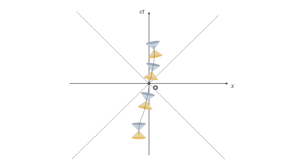 La linea di universo disegnata all’interno delle linee tratteggiate è quella dell’osservatore, dove ogni punto della linea è necessariamente connesso causalmente al precedente e al successivo. Di conseguenza, ogni punto è nel cono del passato del successivo e nel cono del futuro del precedente.