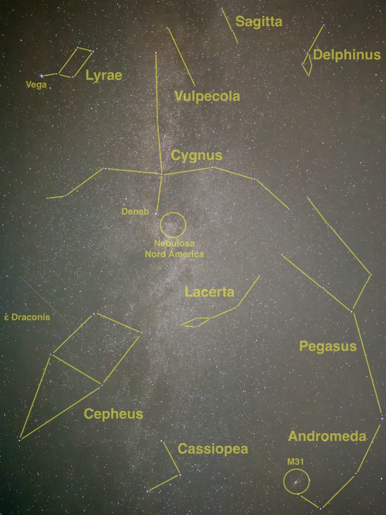 Una volta tornato a casa, appena trovato un po’ di tempo, mi sono divertito a cercare qualche stella famosa e qualche costellazione. Ma con tante stelle visibili nella foto è stato molto facile perdersi. Ho riconosciuto infatti solo Deneb e Vega e solo parte delle costellazioni del Cigno e della Lira (delle quali le due stelle fanno parte). Quindi ho pensato di andare su Stellarium e fare un confronto stella per stella.