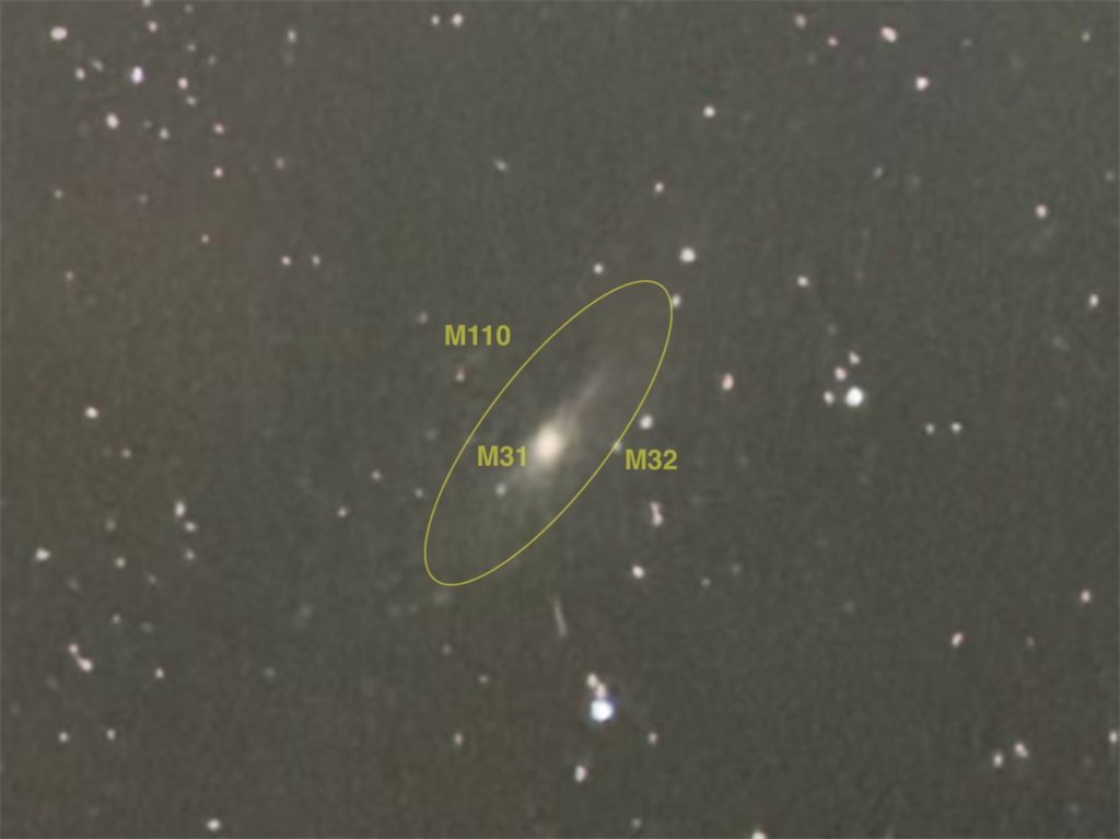 Si notano sia il nucleo e parte del disco di M31 che le galassie satelliti M32 e M110 (quest’ultima appena accennata). Nell’immagine qui sotto ho indicato anche la posizione approssimativa del disco completo della galassia di Andromeda, che è parecchio inclinato rispetto alla linea di vista (circa 77°):