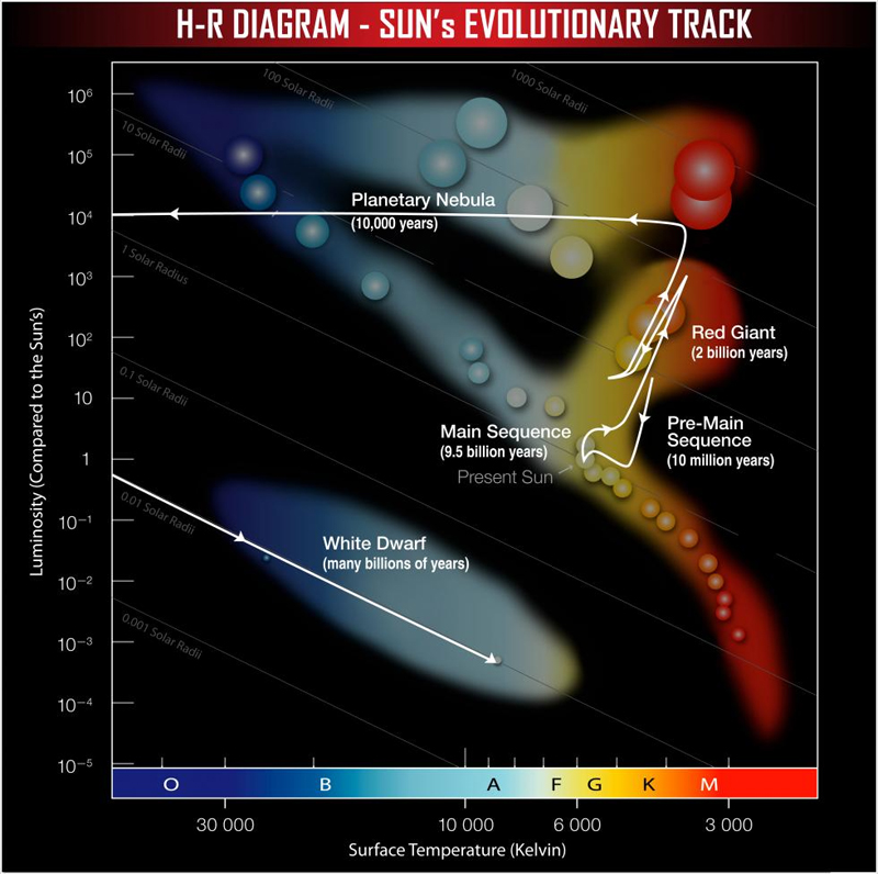 Guardavo il Sole al centro della Sequenza Principale e, seguendo le frecce, ne ripercorrevo l’evoluzione fino al suo destino, fra 5 miliardi di anni, di diventare una gigantesca sfera rossa che inghiottirà Mercurio, Venere, e forse anche la Terra. Poi, fra circa 7 miliardi di anni, il Sole espellerà violentemente gli strati esterni in una esplosione che formerà una nebulosa planetaria, lasciando dietro di sé una nana bianca, calda e poco luminosa. Un tizzone stellare che impiegherebbe almeno mille miliardi di anni per raffreddarsi, diventando infine un’ipotetica nana nera, prevista dalla teoria ma ancora mai osservata (visto che l’Universo si è formato soli 13,8 miliardi di anni). In questo scenario, la Terra, già morta da un pezzo, sarà freddissima e non avrà nessuna possibilità di ospitare di nuovo la vita.